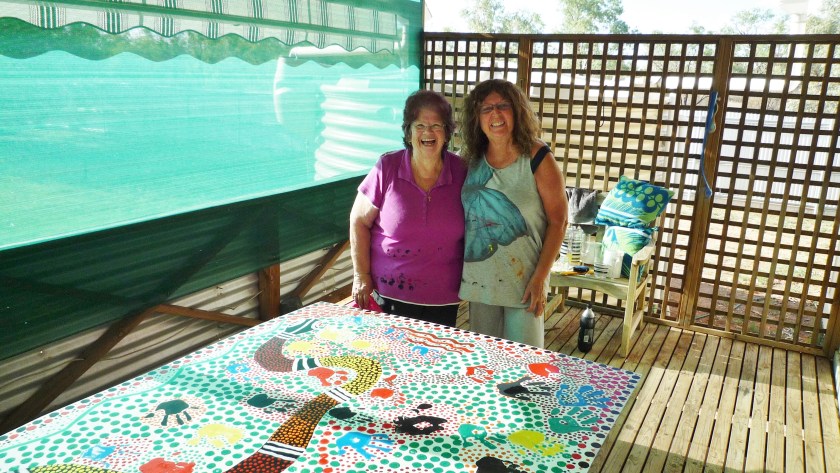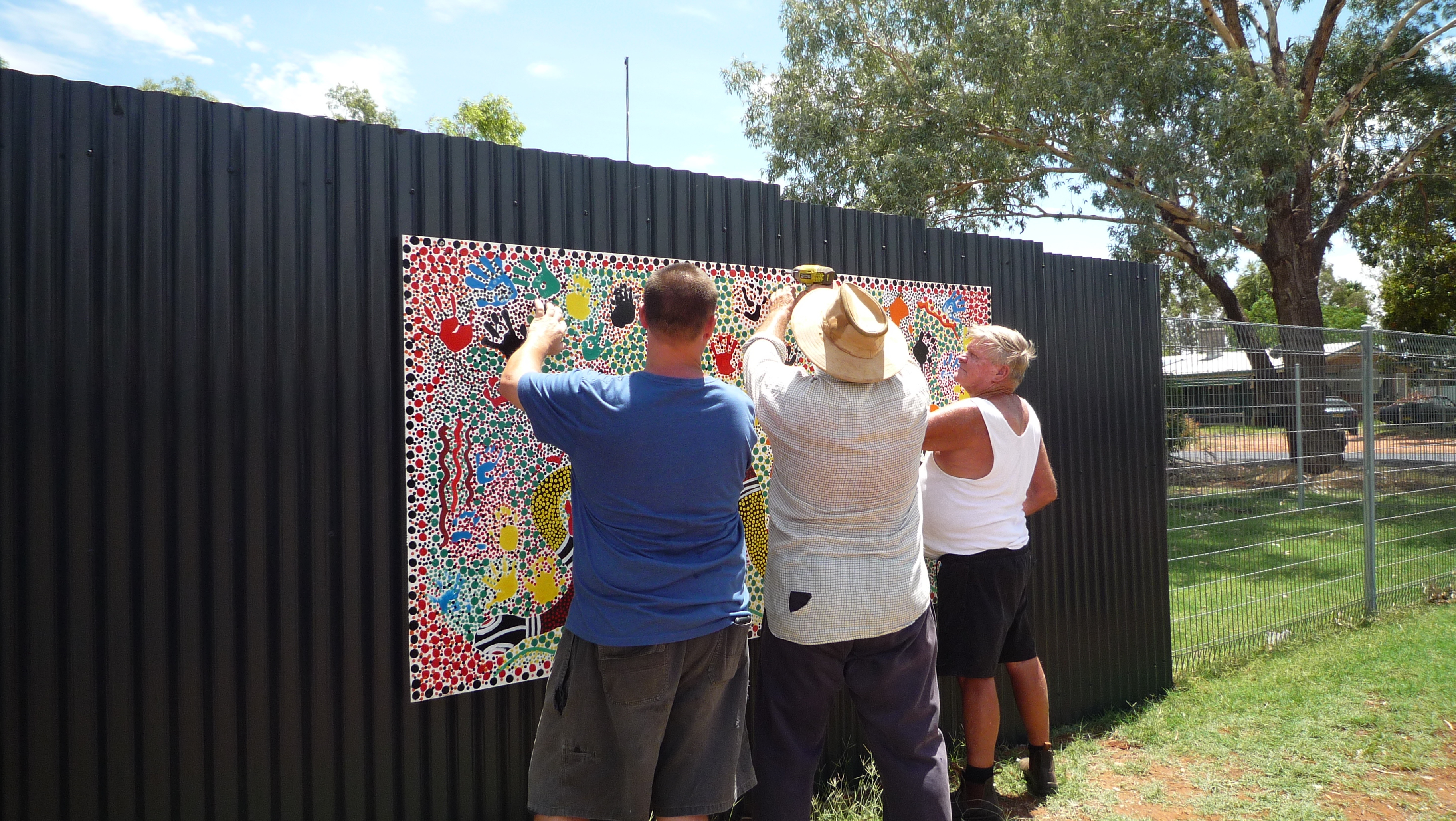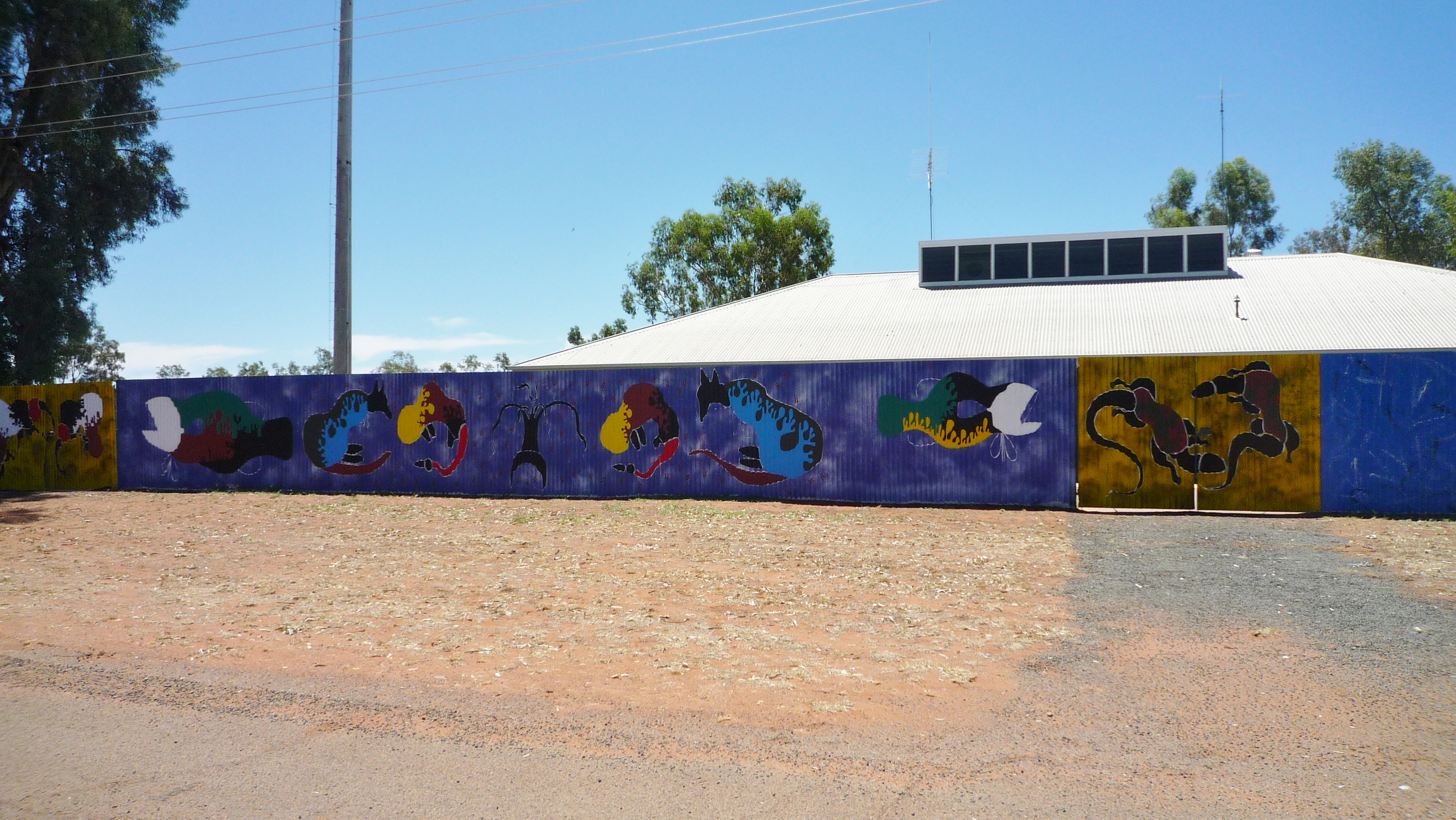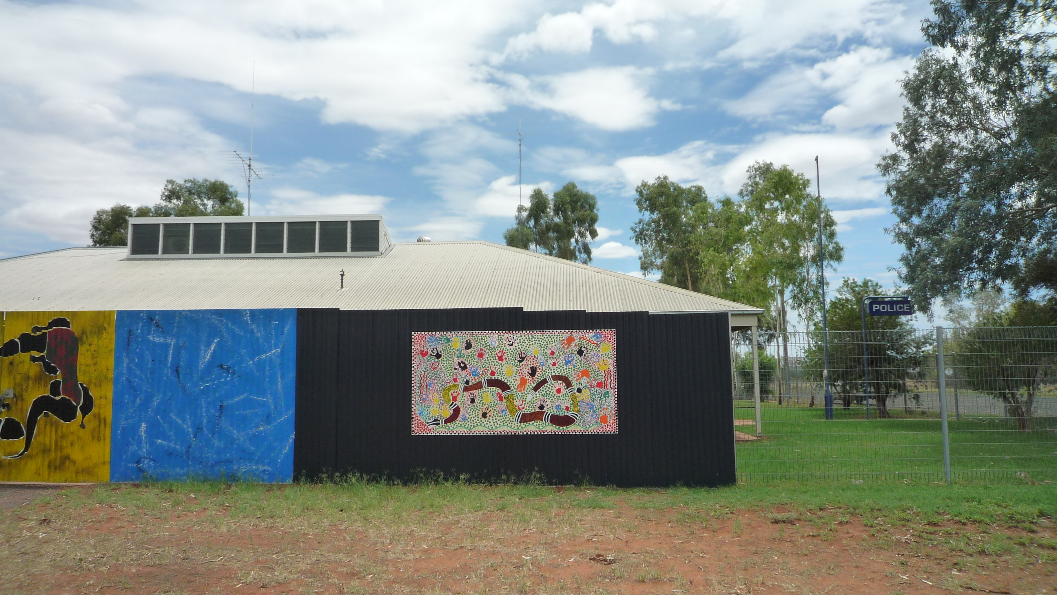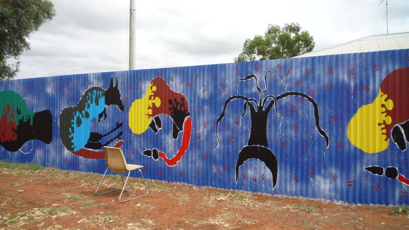 It occurs to me that I haven’t updated you on Fulla’s mural – which is nearing completion. When Kaye and Lynn were given approval by one of the Indigenous elders, the school students’ art mural (of hand prints) was completed and now hangs on the police station corrugated fence wall alongside Fulla’s mural.