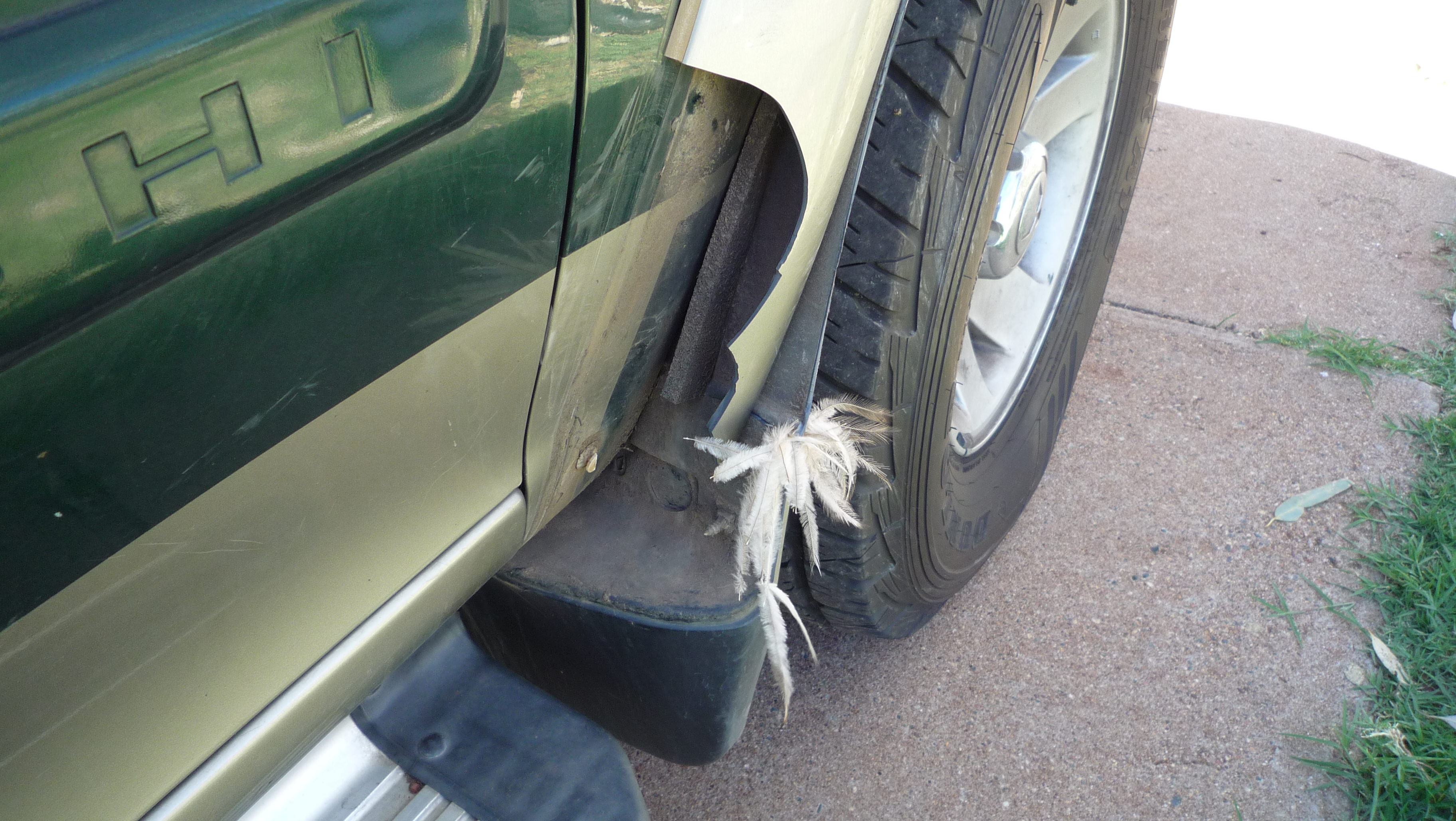 BTW We almost didn’t get compensation for the car repairs because the insurance assessor didn’t believe that all that damage was caused by an emu (it hit the front driver’s side and then bounced along the car, hitting at least three times). Thank goodness we took (mobile phone) photos showing the date of the accident. When we produced them, he quickly backed down….. Nice try though!